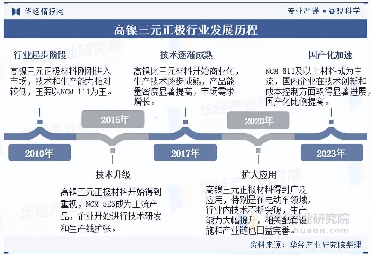 中国高镍三元正极材料行业的发展历程可以概括为几个主要阶段。2010年代初期,行业刚刚起步,技术和生产能力较低,主要以NCM 111为主。到2015年,技术开始升级,NCM 523成为主流,企业开始扩张生产。2017年,高镍比三元材料如NCM 622和NCM 811开始商业化,技术逐渐成熟,能量密度显著提高。到2020年,行业应用范围扩大,技术不断突破,生产能力大幅提升。2023年,高端化和国产化加速,NCM 811及以上材料成为主流,国产企业在技术和成本控制方面取得显著进展。